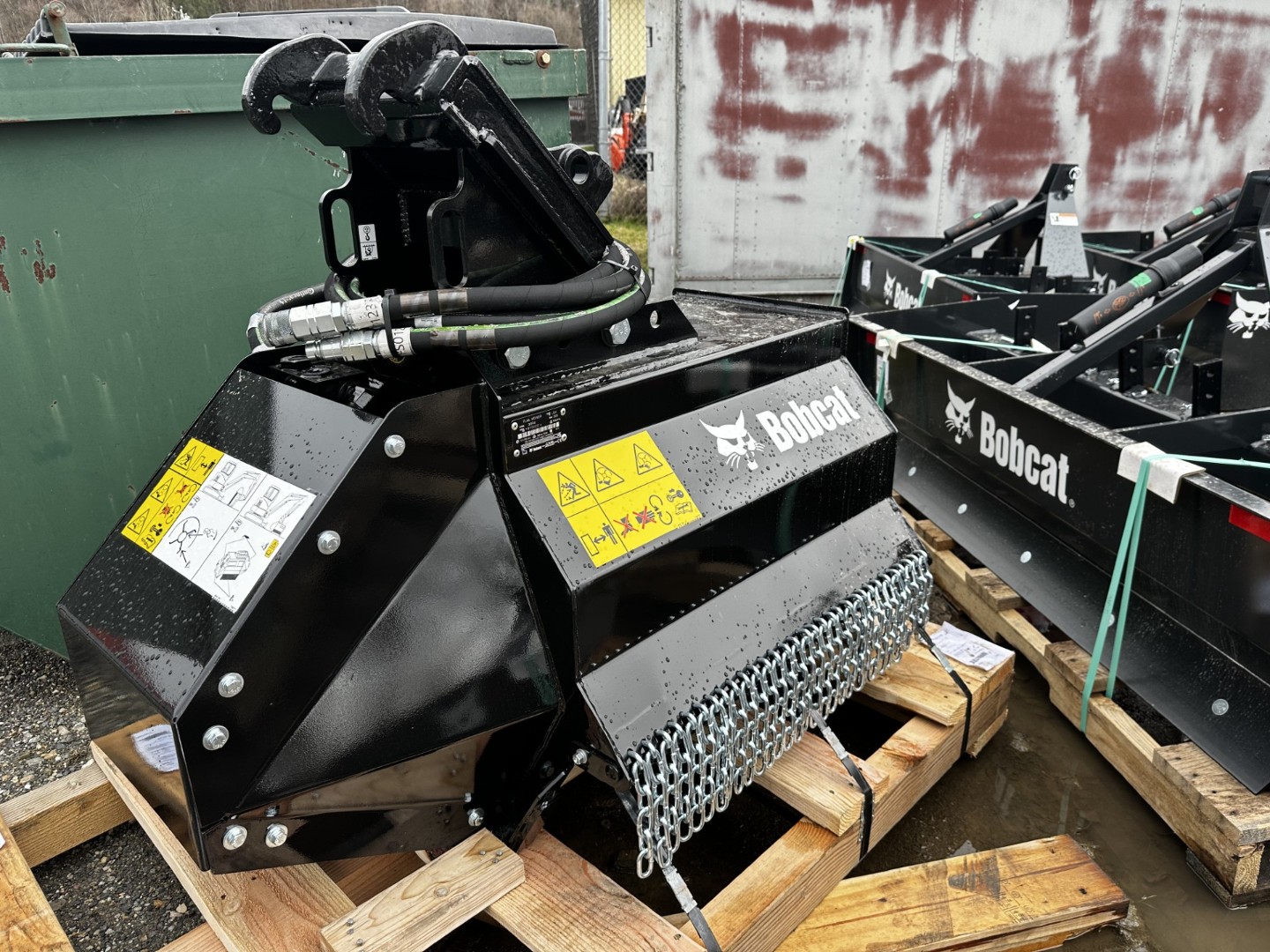 Side safety chains help contain debris within the housing that could be thrown during operation. The rotor brake stops the attachment in 7 seconds or less after hydraulics are deactivated.